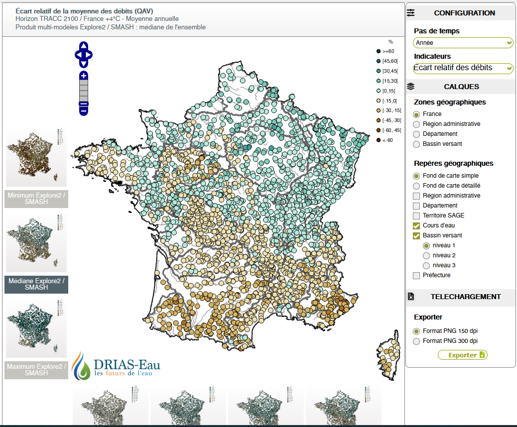 Cette mise à jour permet de visualiser facilement les principaux indicateurs traduisant l’évolution projetée des débits sur la France conformément aux résultats du projet Explore2.