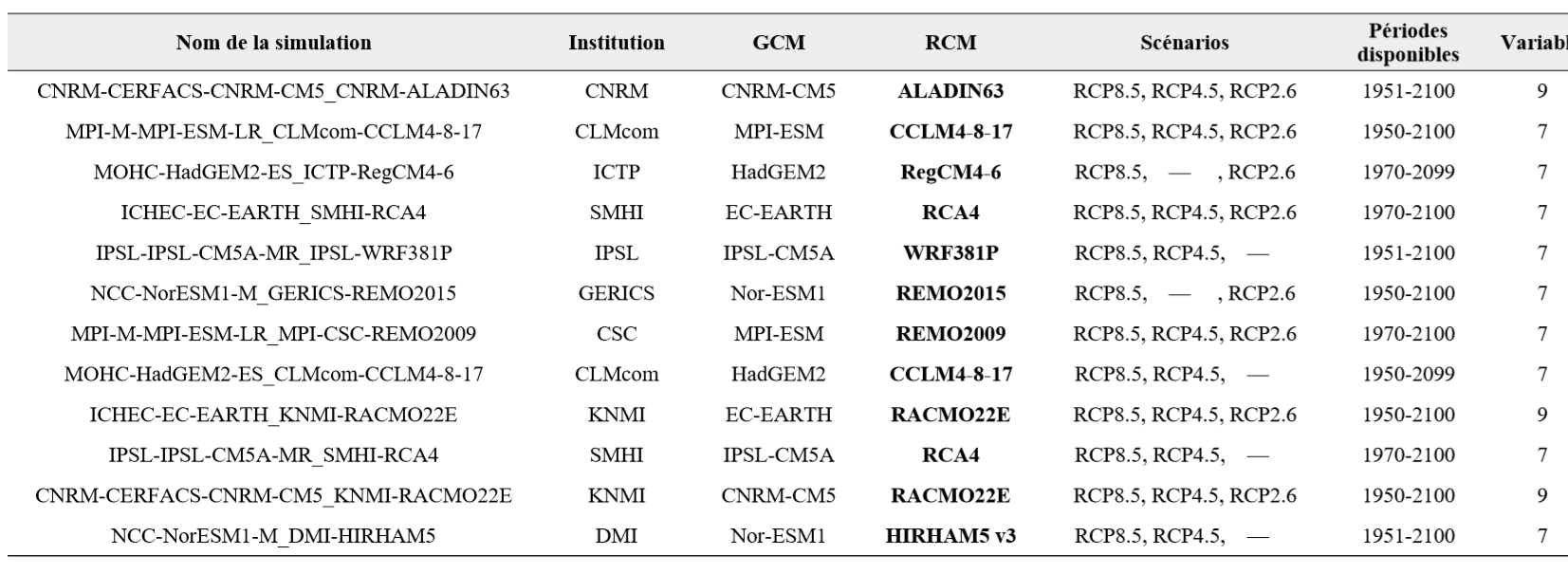 Le tableau ci-dessous synthétise les producteurs, les modèles climatiques ainsi que les variables mis à disposition sur le portail Drias[CLIMAT] :