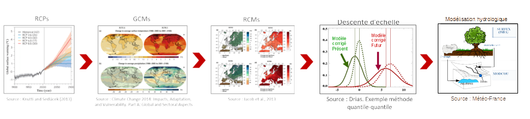 Figure 2 : Les étapes de descente d'échelle depuis la modélisation globale à régionale jusqu'à la désagrégation aux petites échelles spatiales.
