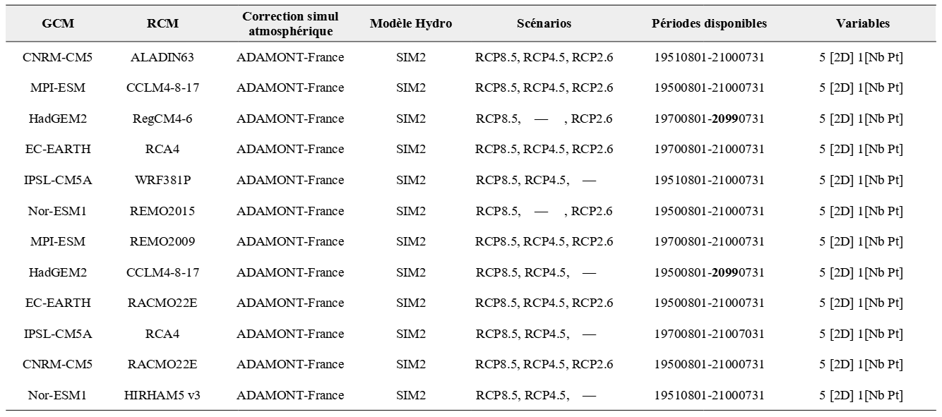 Table 1 : Liste des projections climatiques composant l’ensemble SIM2 DRIAS-2020 et de leurs couverture temporelle.