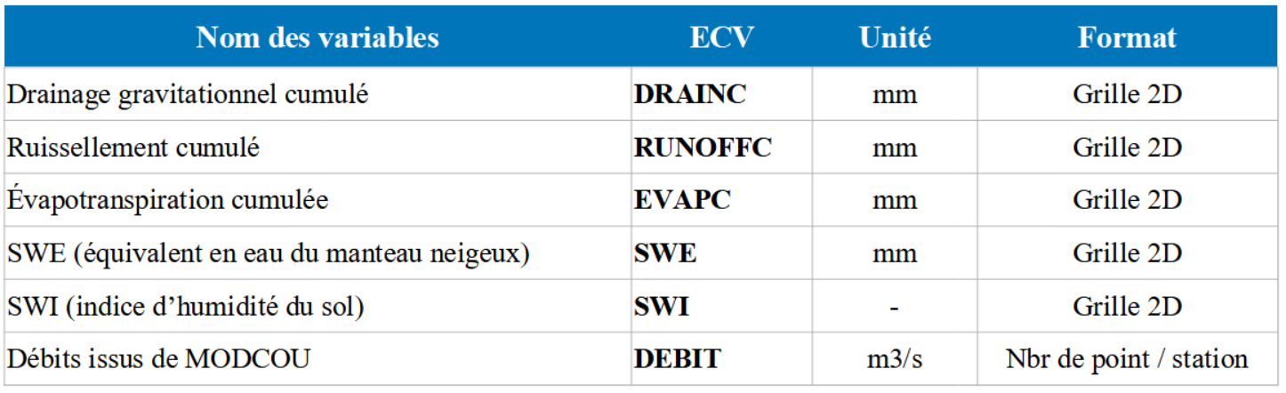 Ces fichiers sont disponibles en format NetCDF, au pas de temps journalier pour une gamme étendue de variables, soit 6 variables voir le tableau ci-dessous (table 2).