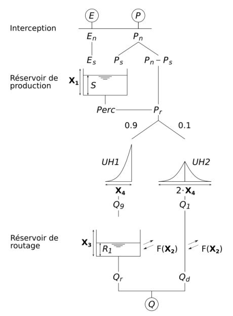 Figure 1 : Schéma de fonctionnement du modèle GR4J (source : (PERRIN et al., 2003)).