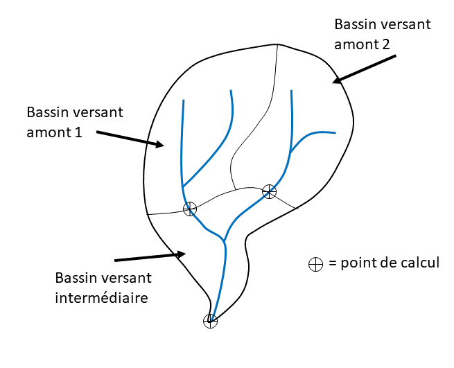 Les variables fournies correspondent à l’agrégation sur l’ensemble du bassin versant des variables de tous les bassins versants intermédiaires le composant, au pro rata de chaque BVI. Ainsi, ces variables sont cohérentes avec les débits fournis, qui eux aussi considèrent l’ensemble du bassin versant pour être calculés. Concrètement, sur la Figure 2, les variables des bassins versants amonts 1 et 2 correspondent aux variables des modèles GR4J appliqués sur ces mêmes zones. En revanche, les variables fournies pour le point de calcul situé à l’exutoire du bassin versant intermédiaire correspondent à la moyenne pondérée des variables des deux bassins versants amonts et du bassin versant intermédiaire.