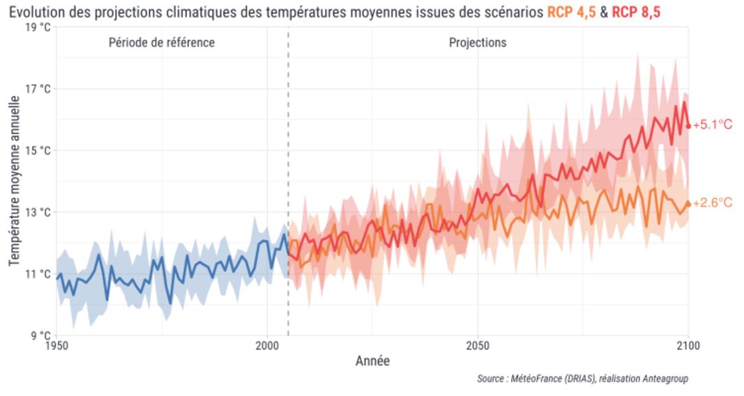 Différents paramètres tels que la température de l’air, l’ETP, la pluviométrie et leur variation saisonnières ont ainsi pu être projetés jusqu’en 2100.