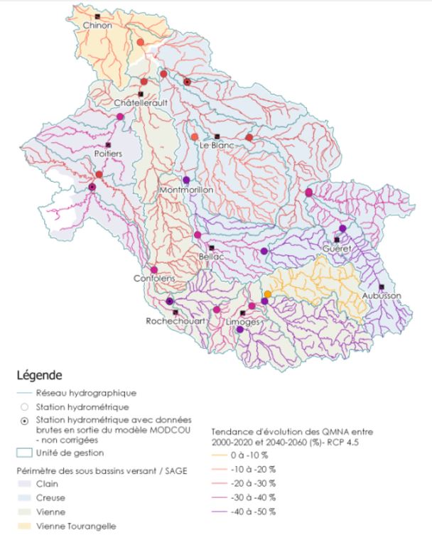 En appliquant ces hypothèses, l'augmentation des températures du bassin de la Vienne par rapport à la période 1976-2005 serait de 1,6 °C pour le scénario RCP 4.5 et de 2,2°C pour le scénario pessimiste (RCP 8. 5) à l'horizon 2050. Les écarts entre les 2 scénarios s'amplifient à la fin du siècle avec respectivement une augmentation de température de 2,6 et 5.1°C. Concernant l'évapotranspiration une augmentation de l'ordre de 10 à 15% est également relevée pour le scénario médian en 2050. A la différence des années passées où nous n'observons pas d’évolutions significatives de la pluviométrie, dans les projections climatiques établies, une diminution des précipitations estivales et à contrario une augmentation des pluies en hiver est mise en évidence avec un accroissement de plus en plus marqué lorsque l'on s'approche de la fin du siècle.