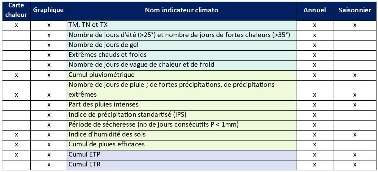 Pour l’analyse rétrospective du climat sur le bassin de la Vienne 3 types de données ont été mobilisées : les données SAFRAN (modélisées - 24 paramètres disponibles), des données observées (SQR) et des données homogénéisées (LSH). Les données LSH qui constituent des séries longues et corrigées sont les plus précises, mais elles concernent seulement 12 stations. Aussi, une partie importante de l’analyse a été effectuée à partir des données modélisées SAFRAN qui offrent une large gamme de paramètres dont les principaux pris en compte dans le de l’étude sont les suivants :