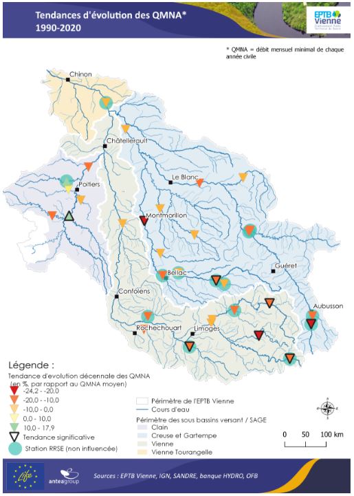 L'une des répercussions de l'augmentation de la température de l'air est un accroissement de l’ordre de 20% de l'évapotranspiration depuis 60 ans. L’amplification de l’évaporation au niveau des sols et des végétaux est un facteur d'amplification du stress hydrique sur le territoire. Ainsi, au cours des 30 dernières années nous pouvons observer une baisse quasi généralisée des débits, en particulier en période estivale. A l'échelle de l'ensemble du bassin de la Vienne cette baisse est particulièrement significative sur les territoires amont du bassin, les têtes de bassin où l'on enregistre des diminutions de l'ordre de -20 à -30% de débits par rapport mesures antérieures. Malgré une chronique de donnée plus courte, une baisse quasi généralisée des niveaux des nappes en moyenne de 10cm/an est observée sur les 10 dernières années aussi bien dans le socle qu’en terrain sédimentaire. |