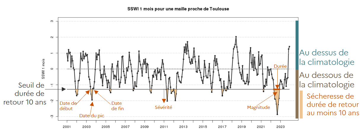 La figure 1 présente un exemple du Standardized SWI à échelle de temps 1 mois pour une maille près de Toulouse. Elle indique les différentes caractéristiques des événements de sécheresse identifiés sur une maille.