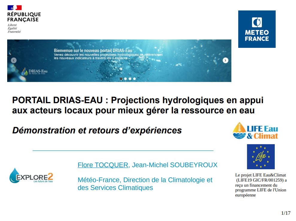 À cette occasion, plusieurs séminaires, groupes de discussion et des stands de retours d’expérience autour de l’adaptation au changement climatique ont eu lieu. Météo-France a été invité, dans le cadre des projets LIFE Eau&Climat, pour présenter le nouveau portail DRIAS-Eau, les futures données produites par le projet Explore2 et engager la discussion sur l’apport du portail, des données, informations et services proposés dans les démarches d’adaptation au changement climatique sur la base de deux retours d’expériences utilisant le portail DRIAS-Eau :