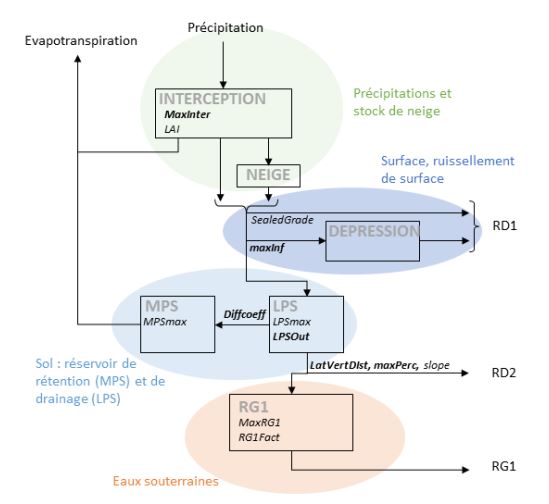 Figure 1 : Schéma conceptuel du modèle hydrologique dans chaque maille du modèle.