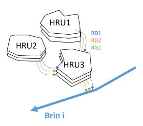 | Figure 2 : Schéma conceptuel du routage des flux hydrologiques entre HRU puis dans le réseau hydrographique. |