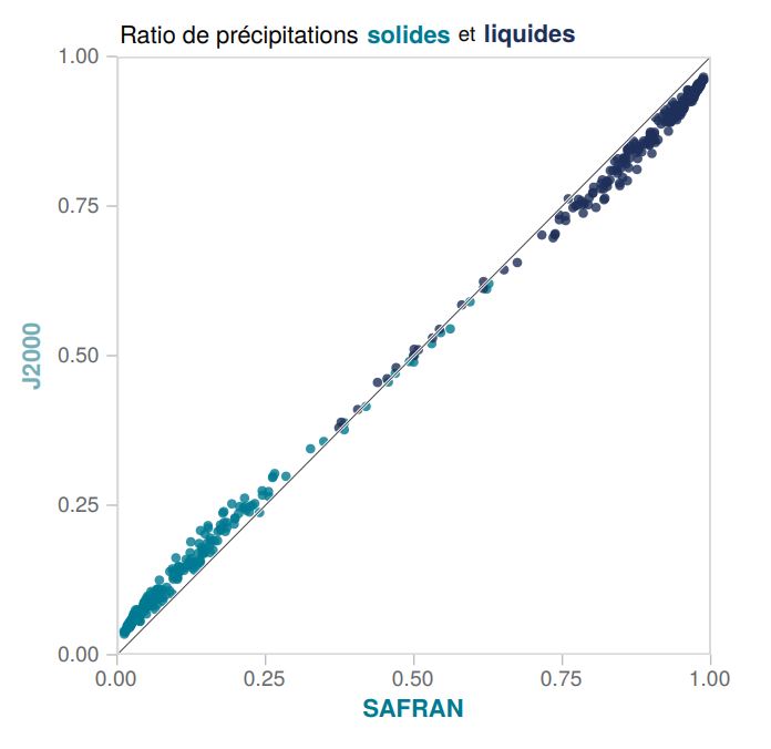 Un traitement est effectué afin de déterminer les proportions de précipitations sous forme de neige et de pluie. Les précipitations sont considérées comme de la neige lorsque la température moyenne journalière est inférieure à +1°C (resp. +1°C), ou comme de la pluie si cette température est supérieure à +3°C (resp. +4°C) pour le Rhône (resp. pour la Loire). Entre ces deux températures, une fonction linéaire est appliquée afin de répartir les précipitations. Les fractions moyennes de précipitations neigeuses par rapport à la précipitation totale, estimées sur la période 1976-2019 sur les stations de référence, sont bien corrélées à celles calculées à partir des données d’observations SAFRAN sur la même période (Figure 3. Notons toutefois des valeurs de fraction neigeuse plus élevées que celles issues de SAFRAN en moyenne montagne.