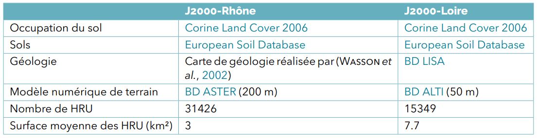 Tableau 1 : Quelques caractéristiques du modèle hydrologique J2000-Rhône et J2000-Loire |