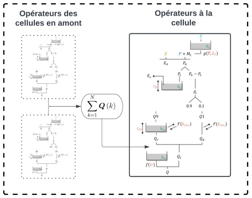 Dans le cadre du projet Explore2, le modèle SMASH a été mis en oeuvre à un pas de temps journalier, à une résolution spatiale de 1 km et dispose d’une structure d’opérateurs hydrologiques composée de cinq paramètres (Figure 2). La structure est composée d’un module neige degré-jour, des réservoirs de production et transfert du modèle GR (PERRIN et al., 2003) et un réservoir de routage.