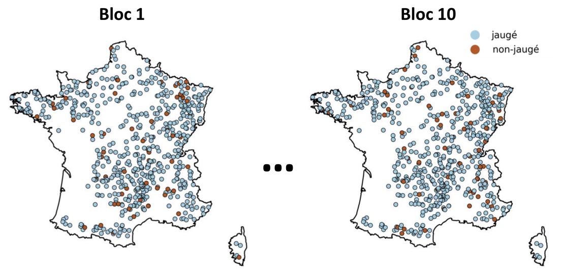 Figure 3 : Représentation des différents blocs crés pour les besoins de la validation croisée. Chaque bloc est constitué des stations d’évaluation dont 90% sont jaugées et les 10% restantes non-jaugées. Sur l’ensemble des 10 blocs, un bassin est considéré non-jaugé une unique fois.