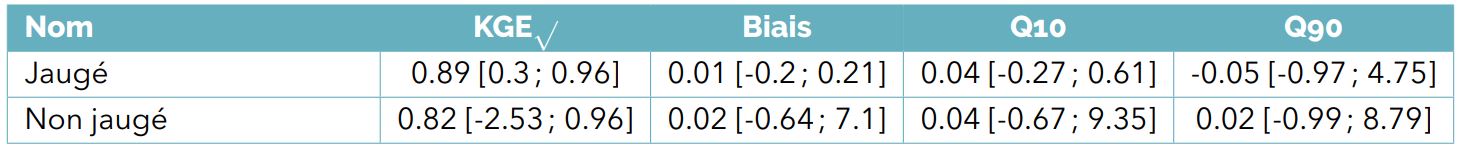 Tableau 1 : Performance de SMASH avec calage des données aux stations (Jaugé) et transfert des paramètres depuis des stations voisines (Non Jaugé) (médiane [minimum ; maximum]).