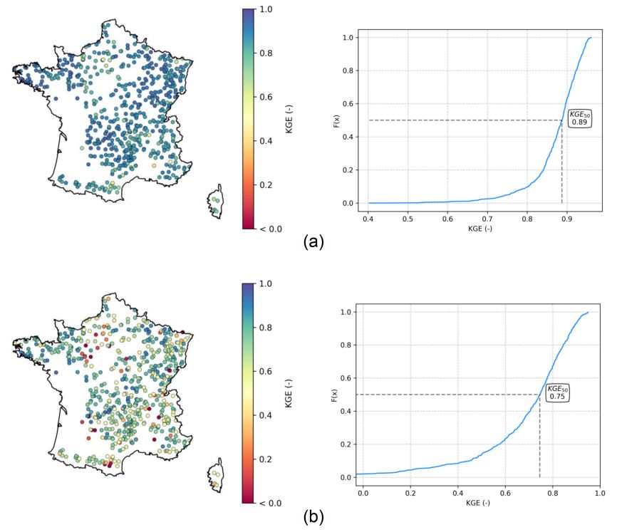 Figure 4 : Performance en termes de KGE du modèle SMASH en calage local uniforme (a) et en extrapolation (b) sur les stations de référence.
