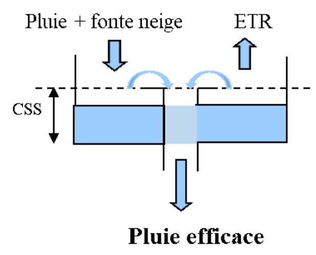 La pluie efficace est calculée au travers d’un bilan hydrique du sol réalisé en chaque maille d’une grille régulière (grille SAFRAN dans le cadre d’Explore2). Dans l’optique d’intégrer une prise en compte de l’incertitude liée au choix du modèle de bilan hydrique, trois formules différentes sont utilisées pour les calculs (THORNTHWAITE, 1948; EDIJATNO et MICHEL, 1989; DINGMAN, 2002). Le résultat final est obtenu en calculant la moyenne des trois chroniques de pluie efficace obtenues à l’aide de ces formules.