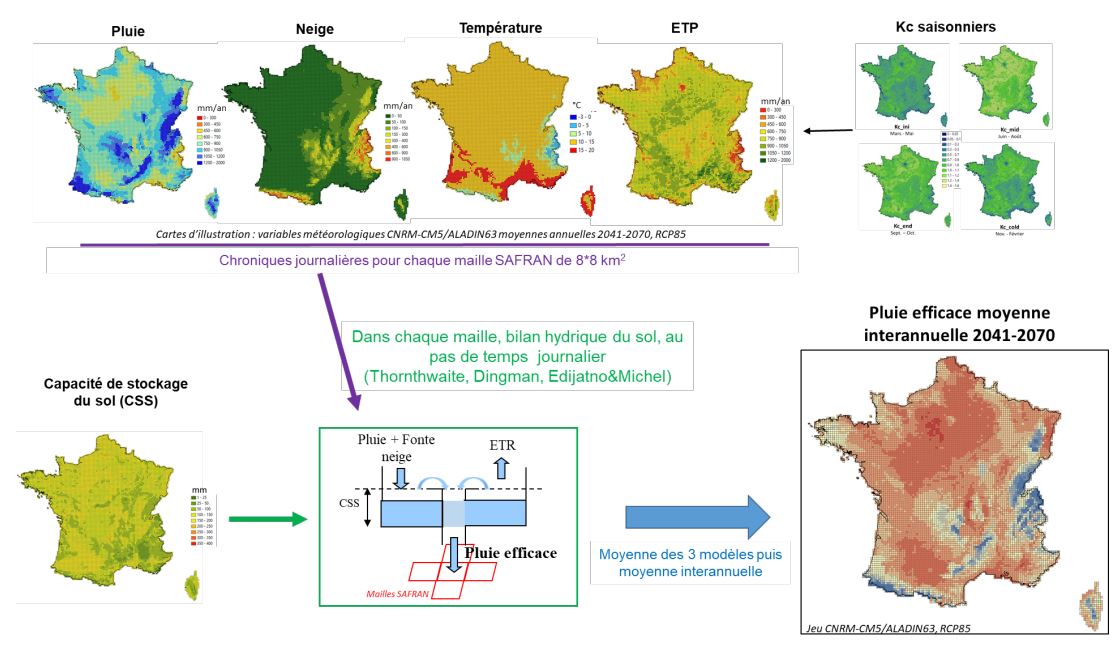 La méthode de modélisation adoptée repose sur la réalisation d’un bilan hydrique à la surface du sol pour le calcul de la pluie efficace, et sur l’utilisation d’un coefficient, que l’on appelle Ratio d’Infiltration de la Pluie Efficace (RIPE, Section 2.3), pour simuler son infiltration dans le sous-sol. Les données d’entrée du modèle sont les chroniques journalières météorologiques ou les projections climatiques qui sont mises à disposition sur la grille SAFRAN. Les paramètres du calcul sont la Capacité de Stockage du Sol (CSS, Section 2.3) et les coefficients culturaux saisonniers (Kc, Section 2.3), qui sont estimés ou calculés à la même résolution spatiale.