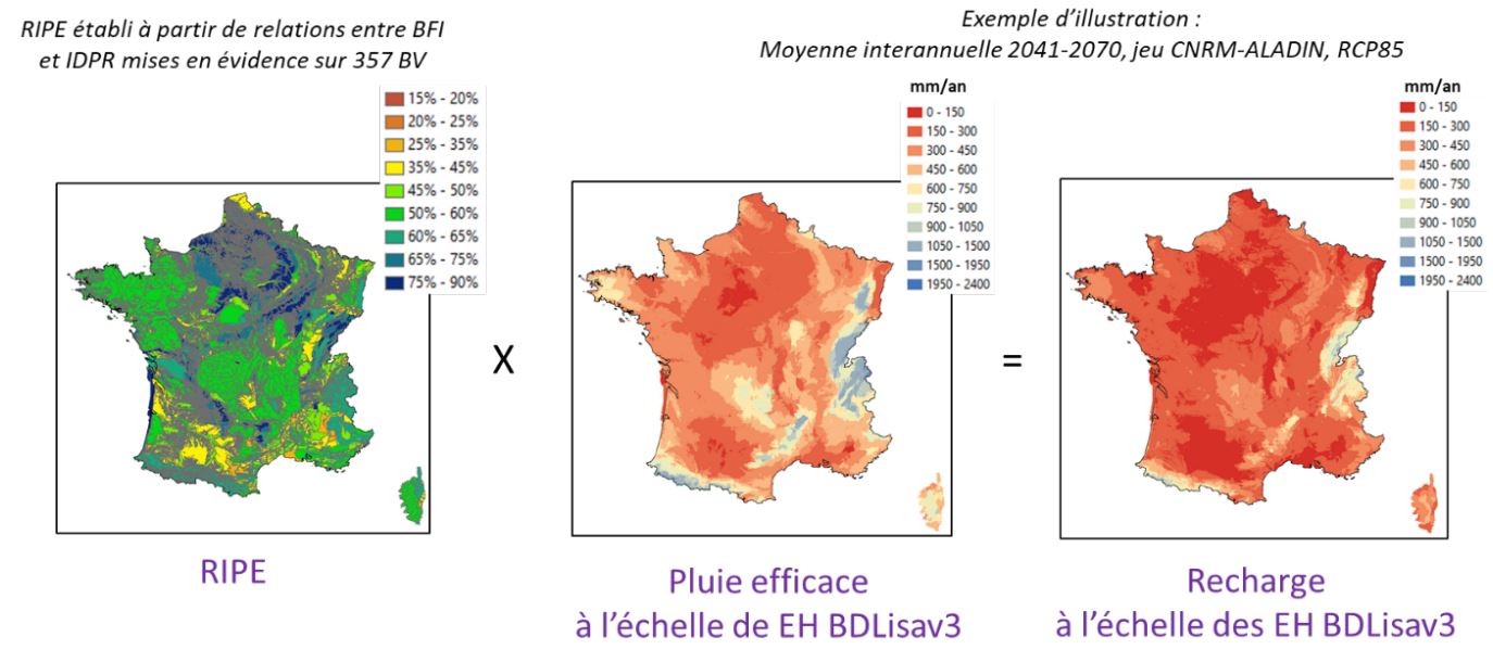 On dispose d’une estimation du ratio d’infiltration de la pluie efficace (RIPE, Section 2.3) pour chaque entité hydrogéologique définie dans le référentiel hydrogéologique français (BDLISA, version 3). C’est donc seulement à cette échelle spatiale que le calcul de la recharge potentielle des aquifères fait sens.