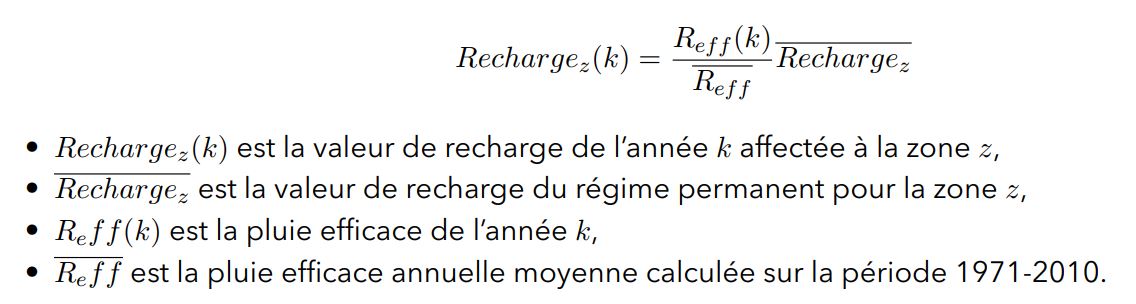 Le mode de calcul de la recharge, pour la période d’actualisation, est le même que celui utilisé lors des phases de calage des différentes versions du modèle, qui se sont succédées depuis 1998. Le calcul est détaillé dans (PÉDRON et al., 2015). Dans cette phase, la recharge, année par année, a été évaluée suivant les secteurs en prenant comme référence la pluie efficace annuelle moyenne de la station météorologique considérée, calculée pour la période 1972-2000 (avec une réserve utile (RU) maximale de 150 mm). A partir des valeurs de recharge du régime permanent, les valeurs, année par année, pour chaque zone d’infiltration définie lors de la phase de calage, sont obtenues par :