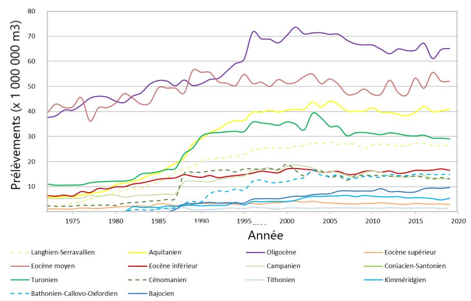 Le modèle prend en compte l’évolution des prélèvements annuels dans chacune des mailles où un prélèvement existe. L’évolution des prélèvements annuels, agrégés à l’échelle du MONA (Figure 1), montre que les aquifères de l’Oligocène et de l’Eocène moyen sont les plus sollicités. En effet, les volumes prélevés dans ces réservoirs s’élèvent à près de 20 % du volume total, pour chacun d’eux. Il apparaît que l’Oligocène est l’aquifère le plus exploité depuis les années 1990.