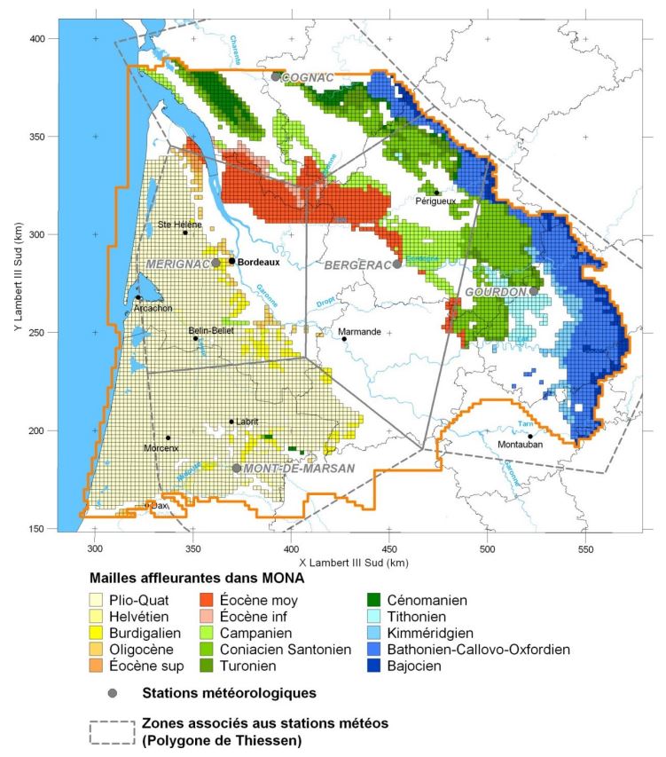MONA est un modèle multi-couches (15 couches aquifères séparées par 15 formations non aquifères) permettant de simuler les écoulements dans les nappes présentes dans les aquifères profonds ainsi que les échanges d’eau entre ces nappes. Il couvre une superficie de 46 032 km². Ce modèle est alimenté par les précipitations dans les zones d’affleurement des aquifères (recharge) et prend en compte les prélèvements connus d’eau souterraine effectués dans les différentes nappes. Les aquifères modélisés sont ceux du Plio-quaternaire, Helvétien, Burdigalien, Oligocène, Eocène supérieur, Eocène moyen, Eocène inférieur, Campanien, Coniacien Santonien, Turonien, Cénomanien, Tithonien, Kimméridgien, Bathonien –Callovo-Oxfordien et le Bajocien.