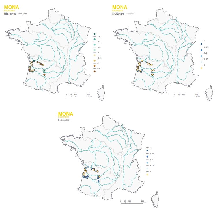 En terme de scores de NSEbiais et de corrélation r, le modèle présente des performances moindres. Il convient cependant de rappeler que le MONA est un modèle annuel dédié à la simulation des nappes profondes et que le calcul de ces scores se prête mal à ce type de modèle. En effet ne sont disponibles que 44 valeurs annuelles au maximum (sur la période 1976-2019 d’évaluation du modèle) à la fois simulées et observées pour chaque piézomètre pour calculer ces scores. Par ailleurs, le niveau moyen de ces nappes profondes varie peu d’une année à l’autre. L’objectif du modèle sera donc surtout de bien reproduire le niveau moyen de ces nappes profondes sur plusieurs années et de réagir aux impacts externes (prélèvements, climats) sur ces niveaux moyens.