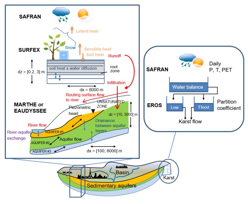 L’analyse météorologique SAFRAN (VIDAL et al., 2010), disponible à l’échelle de la France métropolitaine à une résolution de 8 km, permet de fournir les variables météorologiques (les précipitations liquides et solides, la température, l’humidité relative de l’air, la vitesse du vent et les rayonnements vers le bas) au modèle de surface continental SURFEX (MASSON et al., 2013) qui évalue le bilan hydrique à l’échelle de la France métropolitaine. SURFEX estime la répartition spatiale de l’écoulement entre le ruissellement de surface et la recharge des nappes d’eau souterraines sur la grille de résolution SAFRAN de 8 km. L’infiltration profonde du sol constitue le flux de recharge des aquifères. Le ruissellement de surface peut se produire en fonction de l’excès de saturation ou de l’excès d’infiltration. La simulation des bassins versants dépend de ses caractéristiques hydrogéologiques. Pour les bassins sédimentaires, ces deux flux sont fournis aux modèles MARTHE et EauDyssée. Ces modèles simulent le transfert vers la zone non saturée, les écoulements souterrains dans et entre les couches aquifères, l’acheminement des eaux de ruissellement vers et dans les rivières et les échanges nappe-rivière. Ils prennent en compte les prélèvements d’eau souterraine dans les bassins. La résolution temporelle est journalière et la résolution spatiale varie de 100 m à un maximum de 8000 m. La profondeur de la couche aquifère la plus profonde peut atteindre localement environ 1000 mètres.