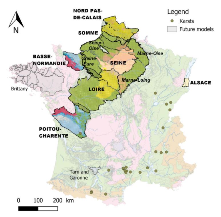 Figure 2 : Carte des modèles régionaux et des systèmes karstiques simulés dans AquiFR. Les contours des modèles sont également représentés avec des couleurs correspondant aux aquifères affleurant par rapport à leurs contextes géologiques. Les zones grises correspondent à des modèles qui seront intégrés dans un futur proche.