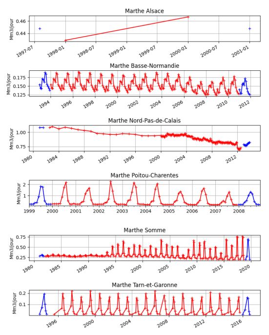 Les prélèvements souterrains sont pris en compte pour un certain nombre de modèles. La Figure 3 montre l’évolution temporelle de l’agrégation spatiale (cumul) de l’ensemble des prélèvements connus (en rouge) pour chacun de ces modèles en million de m3 par jour pour les modèles MARTHE utilisés dans Explore2. Afin de réaliser l’évaluation des modèles sur la période 1976-2019, ainsi que les simulations changements climatiques de 1958 à 2100, ces prélèvements sont extrapolés avant et après les périodes de prélèvements connus. L’extrapolation correspond aux points et lignes bleus sur la courbe. Pour les modèles BasseNormandie, Poitou-Charentes, Somme et Tarn-et-Garonne, le cycle mensuel saisonnier est calculé sur les trois premières années connues puis appliqué sur les années de la période simulée avant le démarrage des prélèvements connus. Par exemple pour le modèle Basse-Normandie, le cycle saisonnier appliqué avant la date des prélèvements connus correspond à la courbe bleue de 1993 à 1994 sur la Figure 3. De même, après la dernière date des prélèvements connus, c’est le cycle saisonnier mensuel calculé sur les trois dernières années de prélèvements connus qui est appliqué (courbe bleue de 2011 jusqu’à 2012 pour le modèle Basse-Normandie). Pour le modèle Alsace, très peu de données de prélèvements sont disponibles ; c’est la moyenne de ces données qui est appliquée avant et après les prélèvements connus.