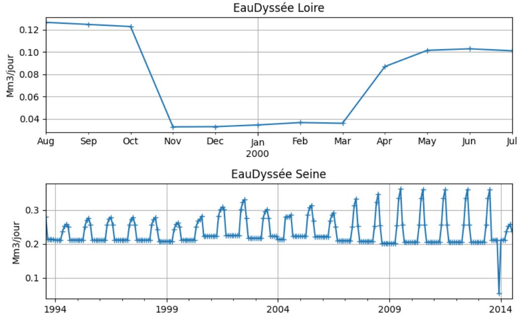 La Figure 4 montre les prélèvements dans les modèles EauDyssée. Le modèle Loire ne dispose que d’une année de prélèvements connus ; c’est cette année qui est appliquée sur toutes les années des périodes simulées, que ce soit pour la simulation d’évaluation en période présente, ou pour les simulations sous changement climatique. Pour le modèle Seine, la première année de prélèvement connu est appliquée aux années simulées précédents la première année connue, et l’avant dernière année de prélèvements connus (2013-2014) est appliquée aux années simulées après la dernière année connue.