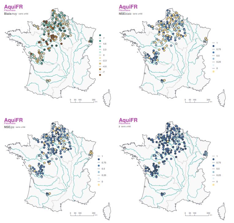 Il est a noté que, comme pour tous modèles spatialisés, les performances d’AquiFR au droit des piézomètres ne préjugent pas nécessairement de la qualité du modèle sur les autres points de grille où aucune observation n’est disponible.